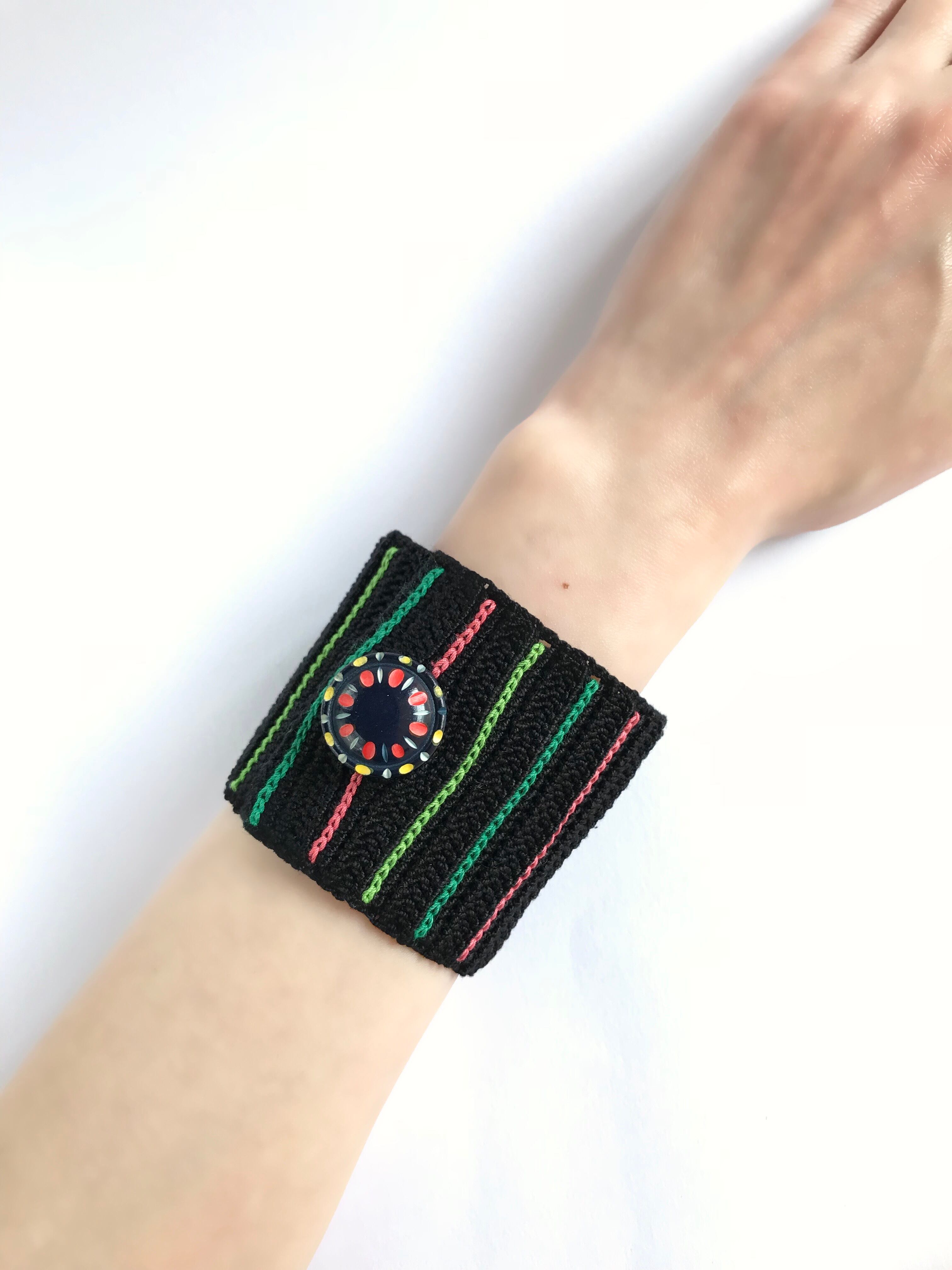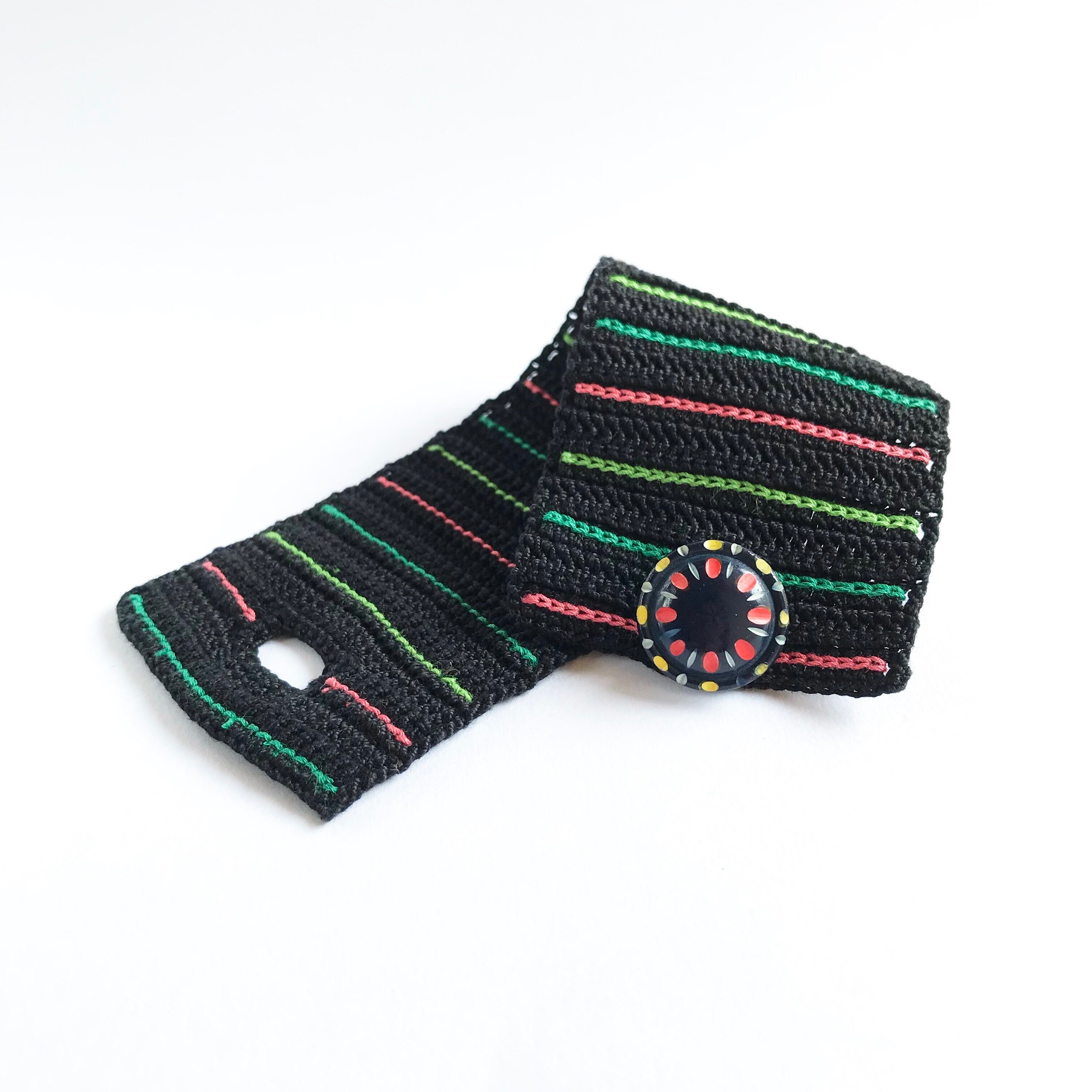 黒をベースに緑、黄緑、ピンクのチェーンステッチを編み入れたカラフルなブレスレットです☆