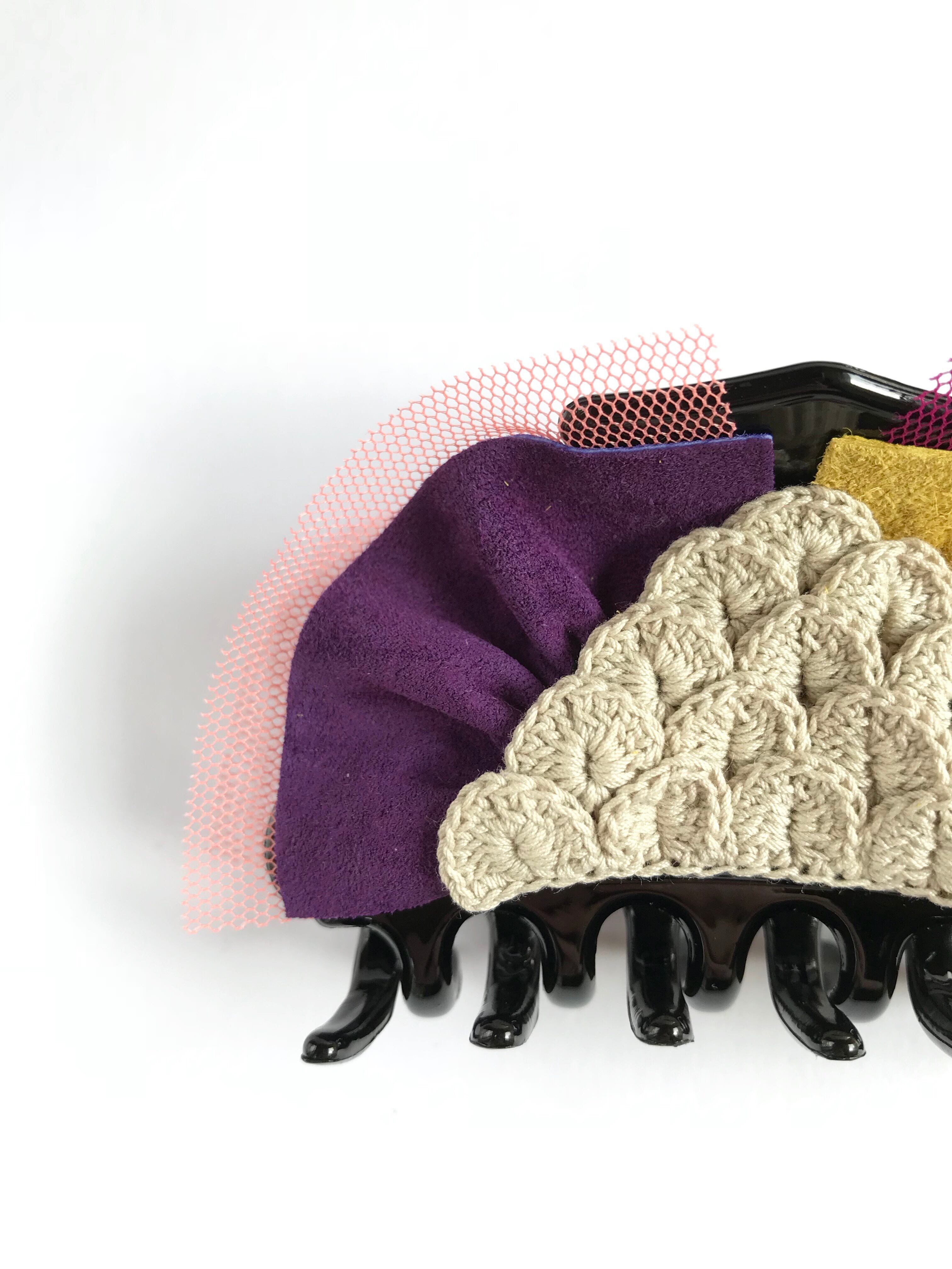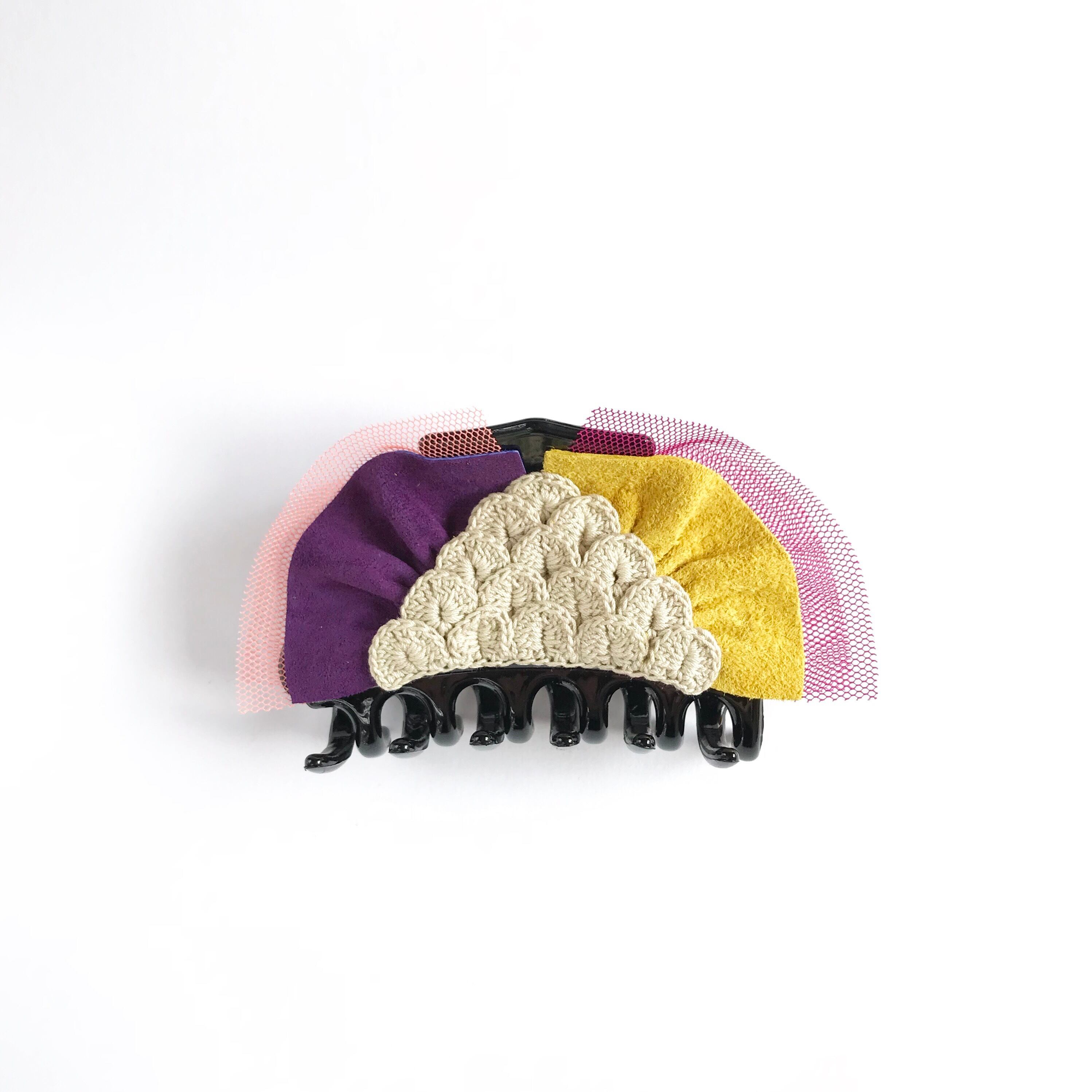 三角に編んだうろこ編みにチュールとピッグスエードを組み合わせたバンスクリップです♡