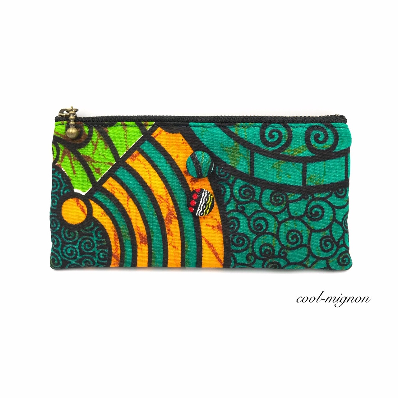 アクセントにアフリカ布のくるみボタンを付けました♡