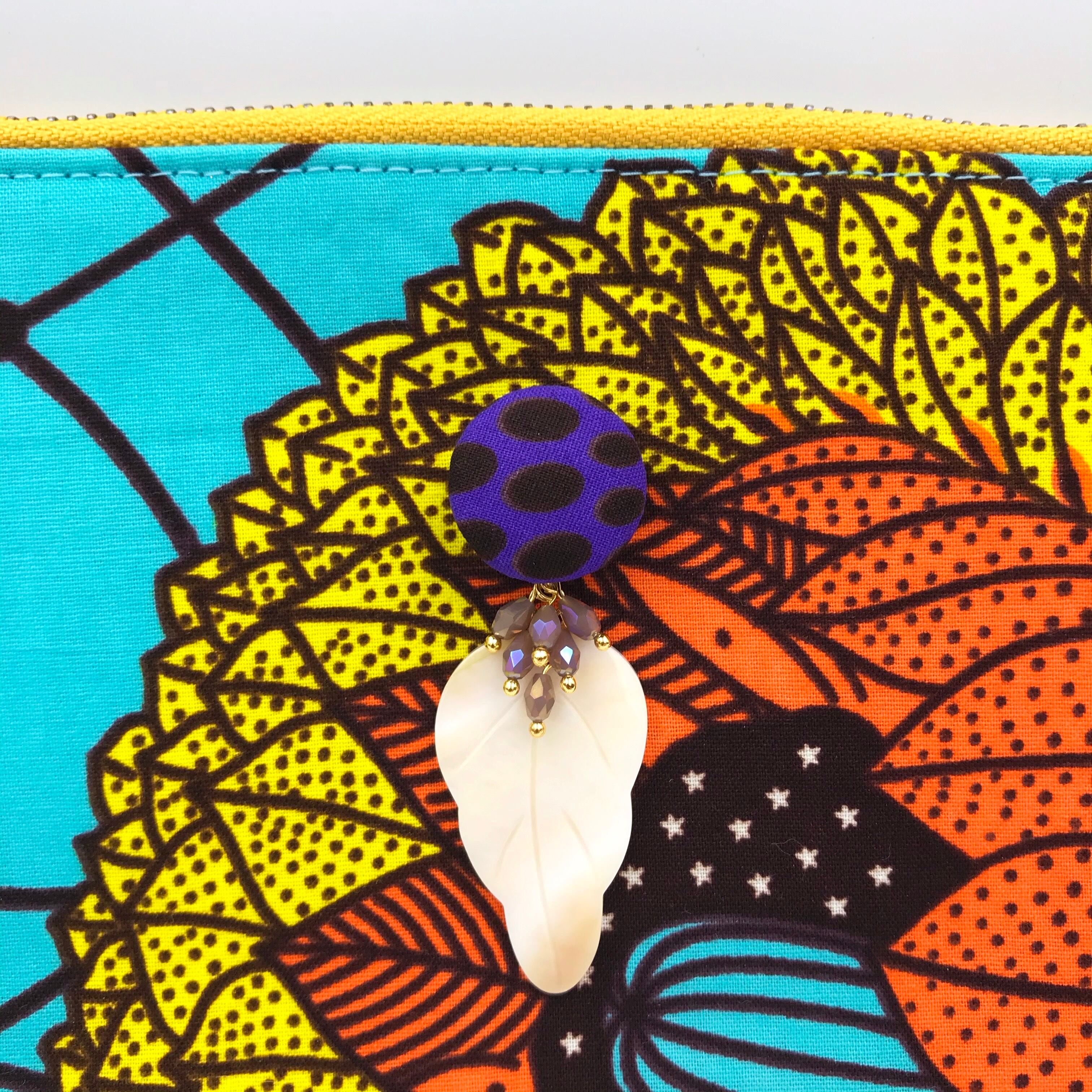 アフリカ布のくるみボタンとリーフ型のシェルチャーム付きです♡