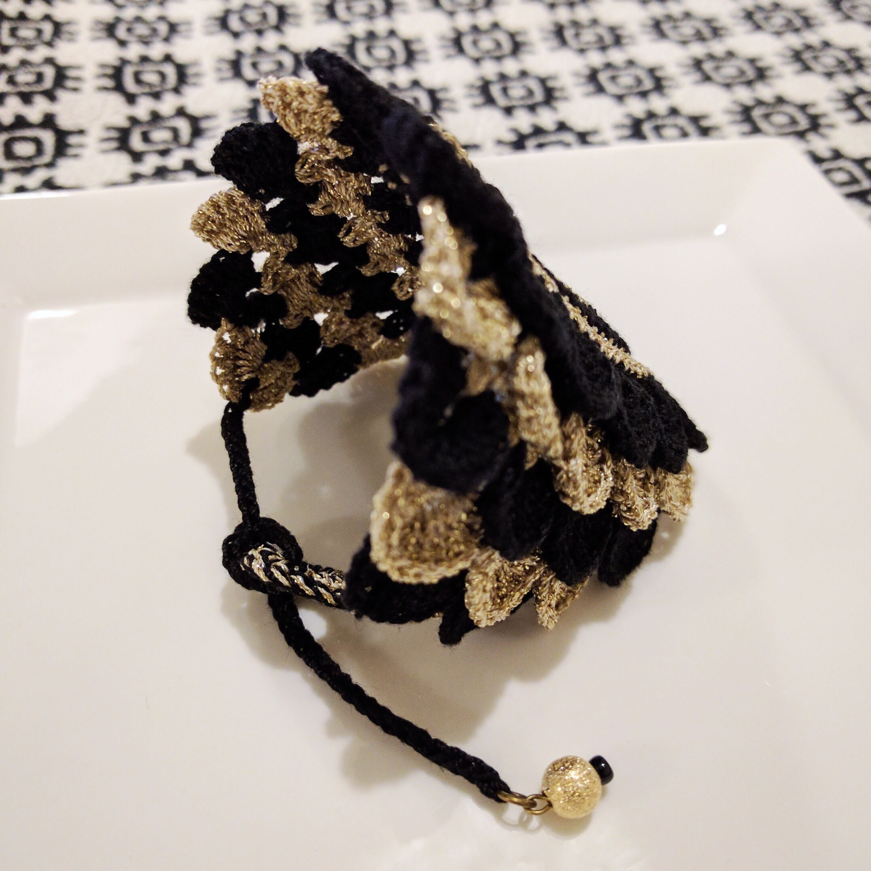 ゴールドとブラックのレース糸でうろこのように編んだブレスレットです♡